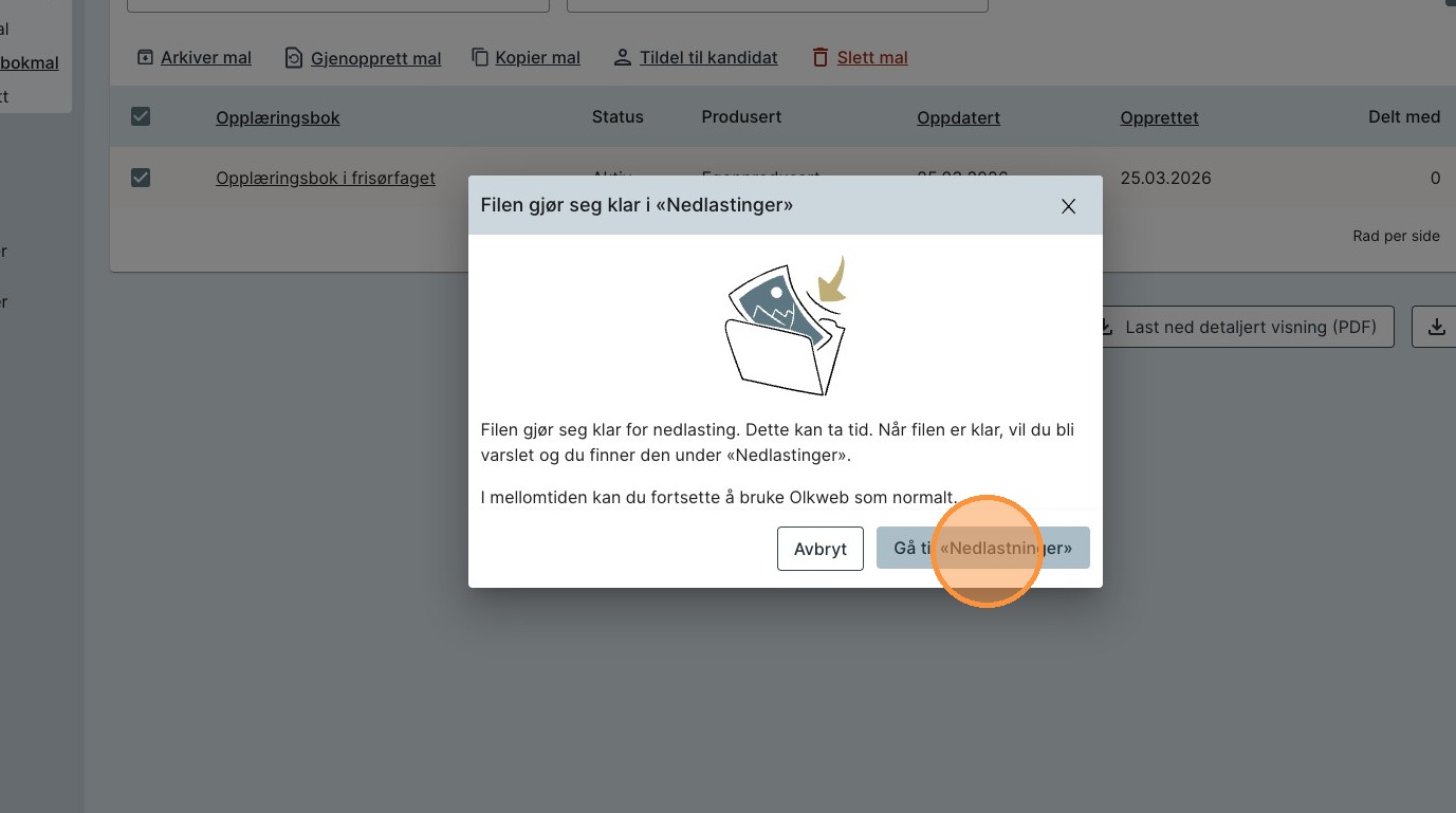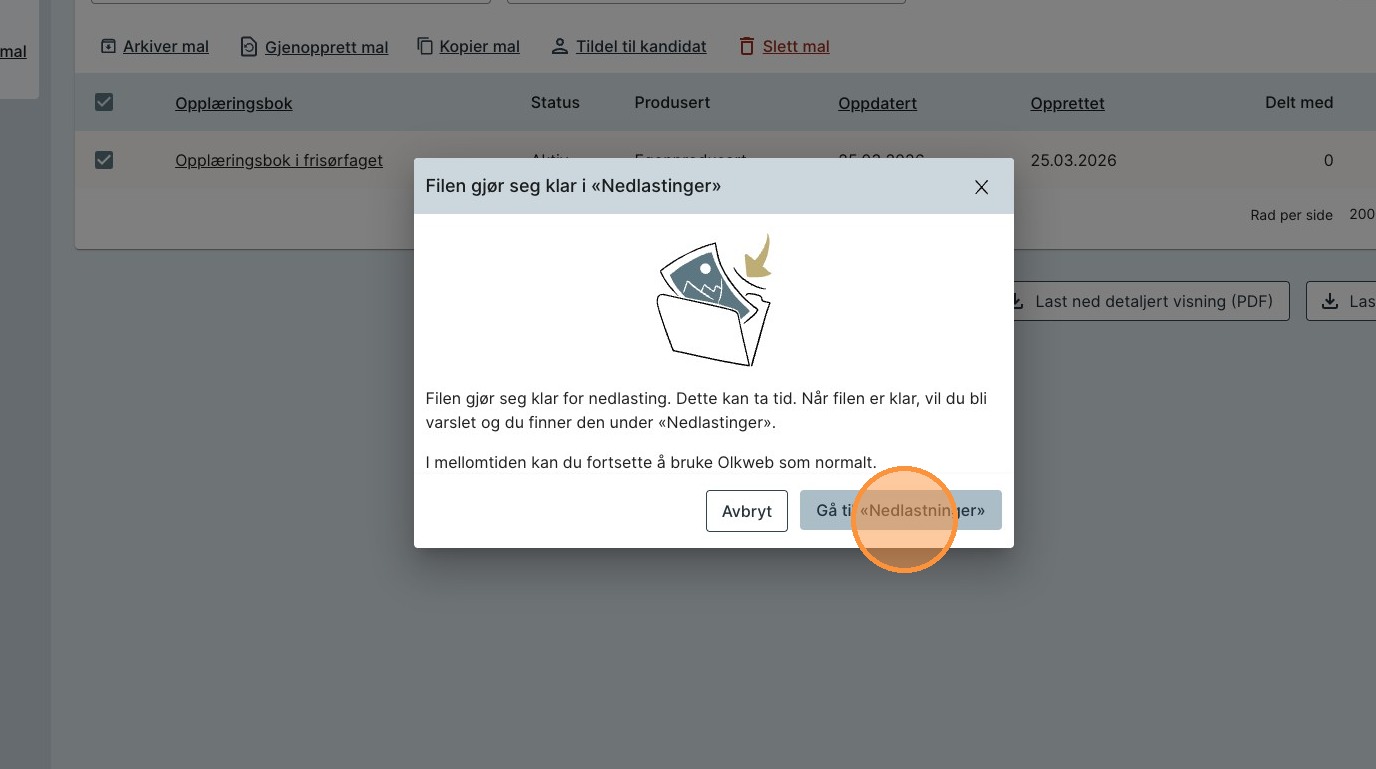 8. Gå så til nedlastinger, enten ved å trykk på knappen «Gå til «Nedlastninger» eller «Nedlastinger» i venstremenyen, og last ned PDF-en når den er klar.