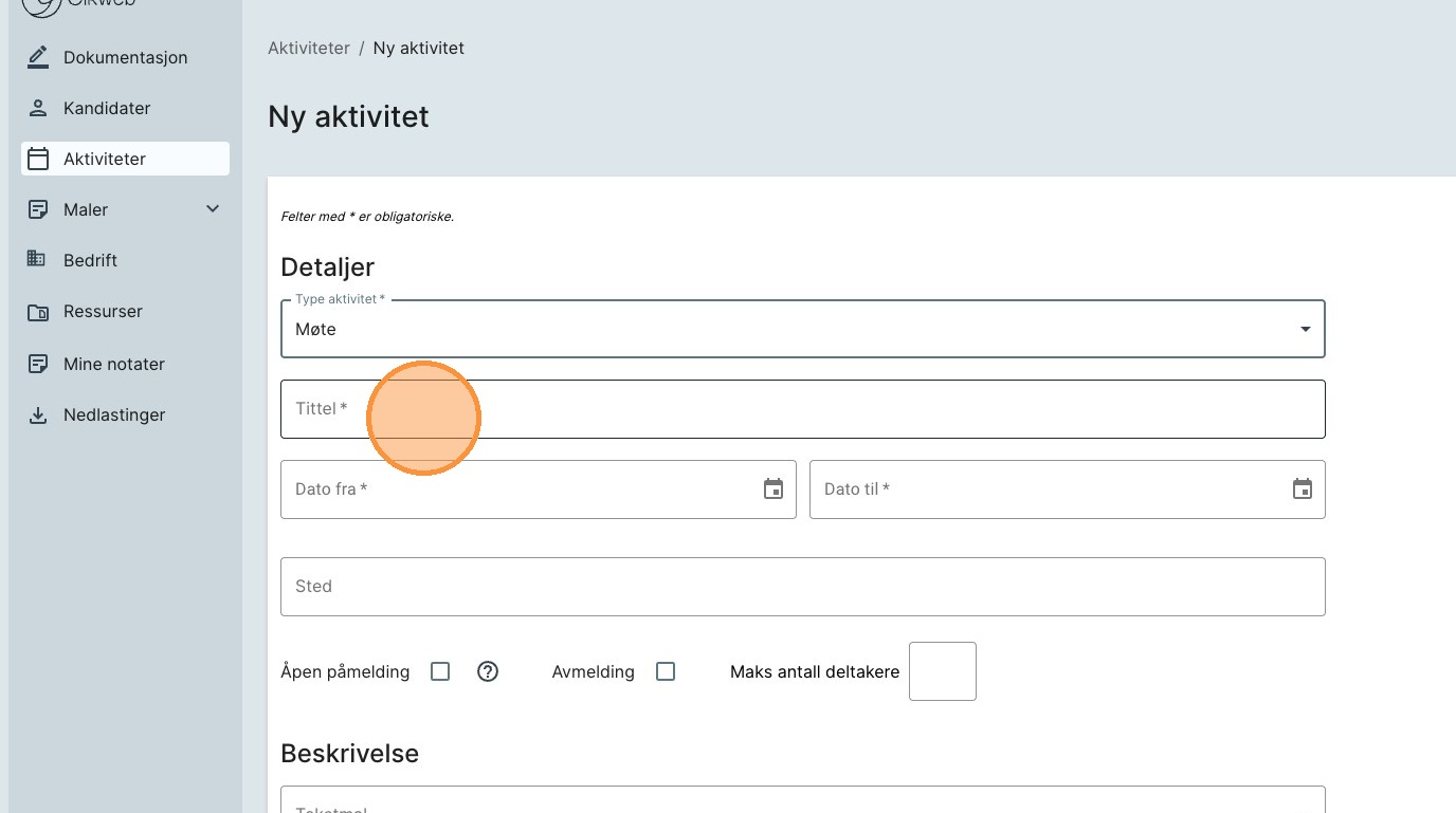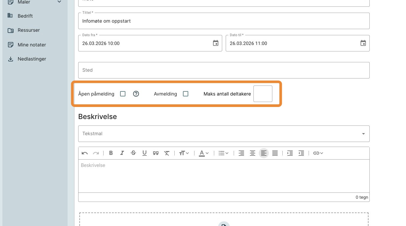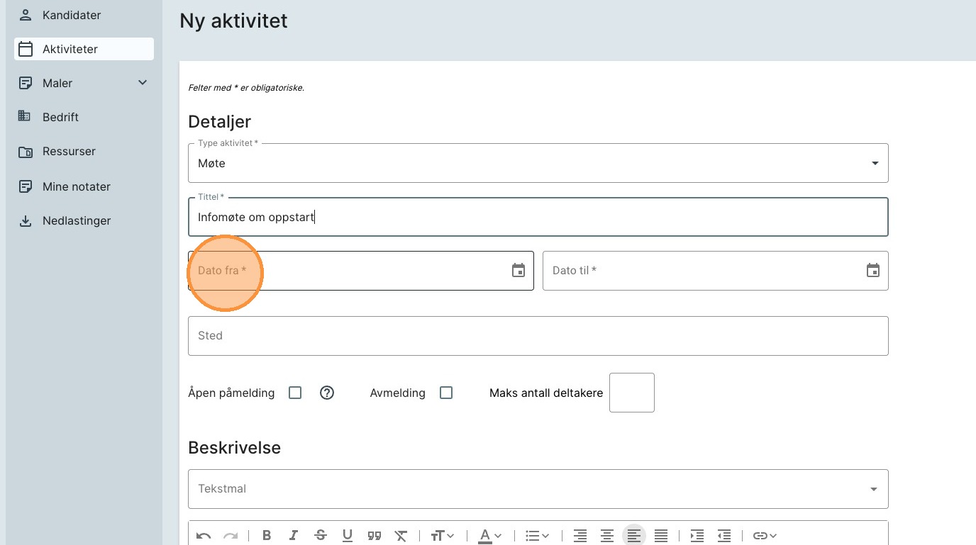 Åpen påmelding: hvis valgt = alle kandidater du har tilgang til, ansatte i samme bedrift(er) som deg og opplæringskonsulenter i opplæringskontoret kan melde seg på aktiviteten din.