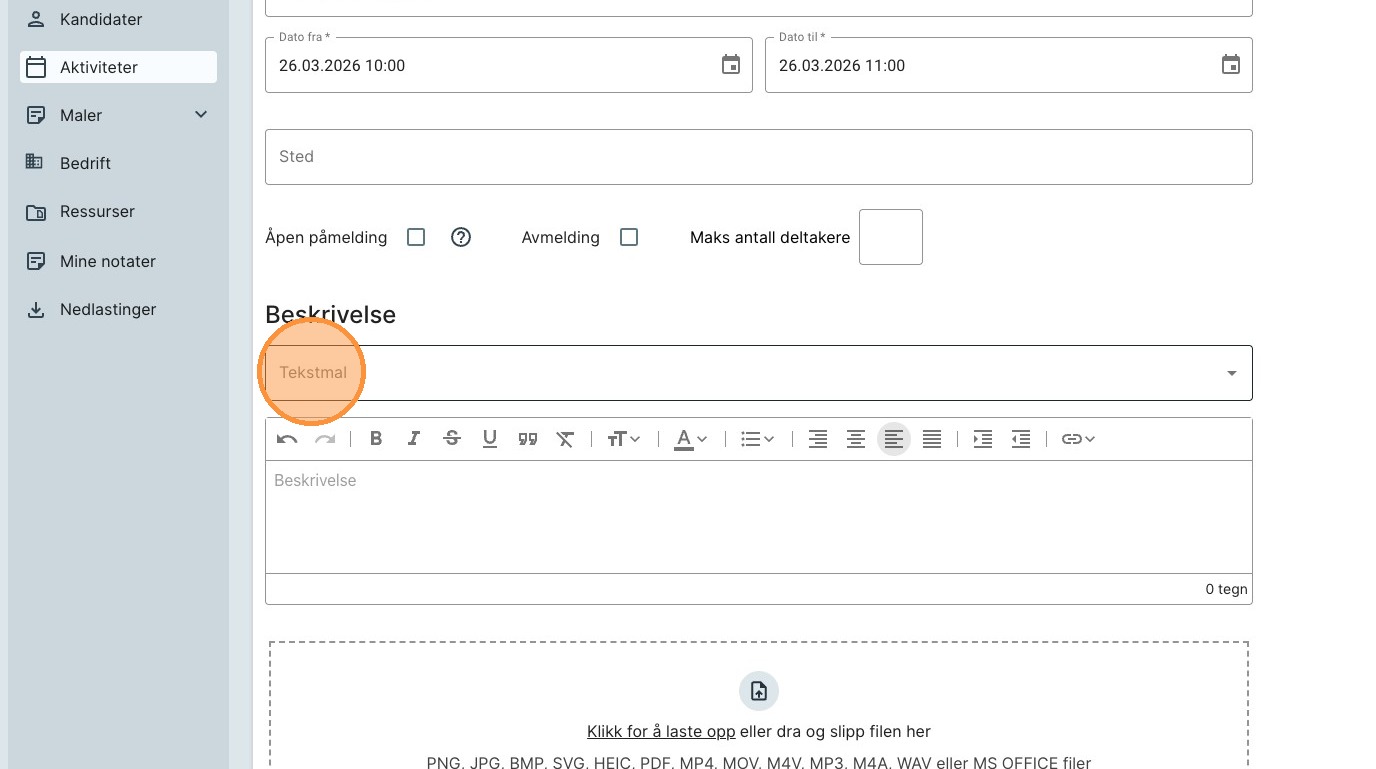 7. Når du skriver beskrivelsen til aktiviteten kan du velge å bruke ferdig lage tekstmaler som du har tilgang til. For å bruke dette trykk på «Tekstmaler» og velg malen du vil bruke.