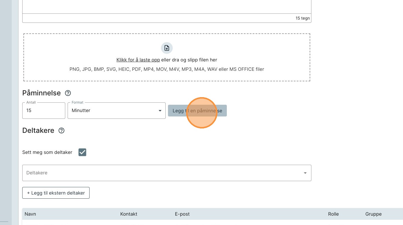 8. Hvis ønskelig kan du sende ut påminnelse om aktiviteten til deltakerene før aktiviteten. En påminnelse kan sendes X antall dager, timer eller minutter før en aktivitet.