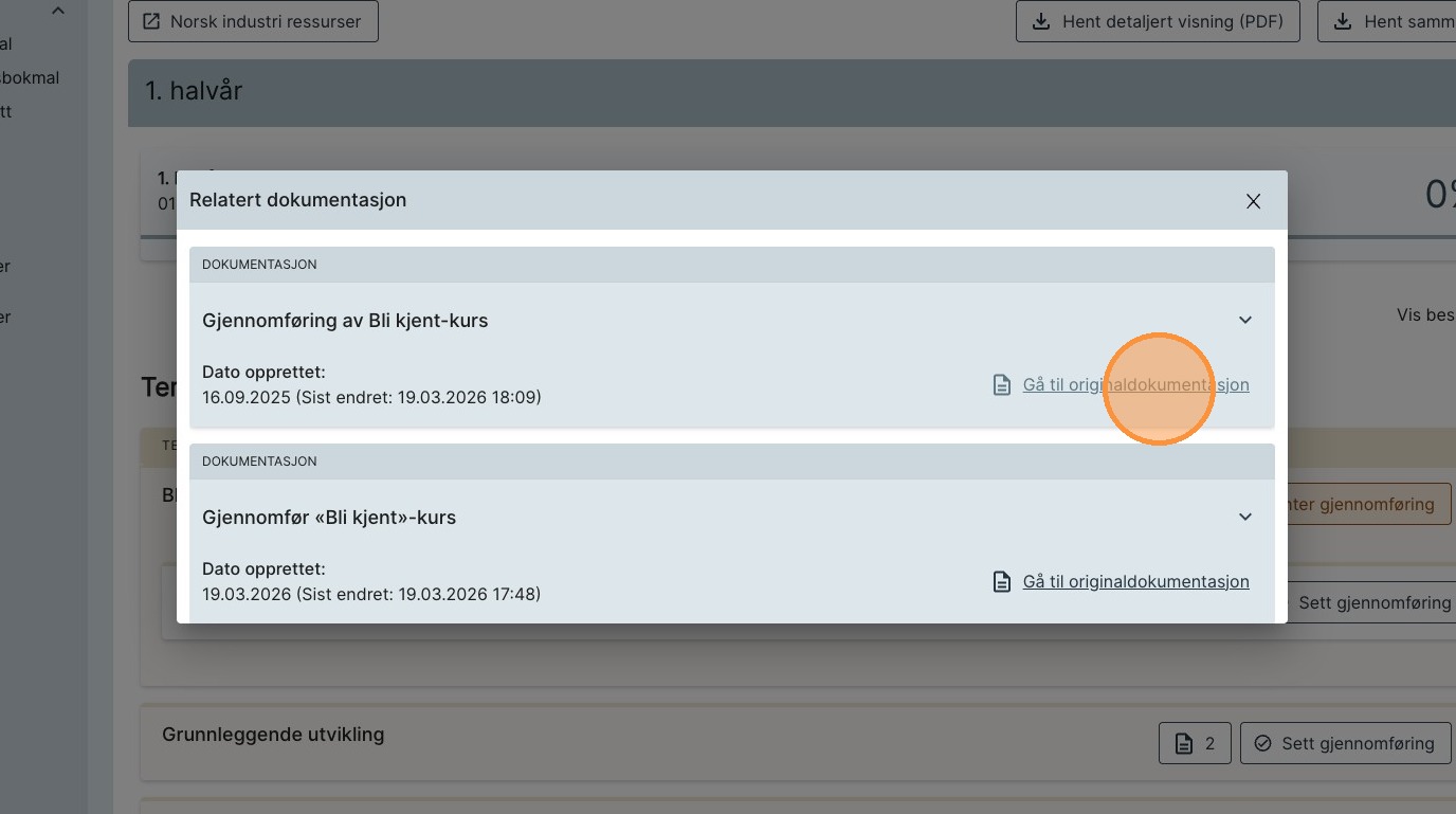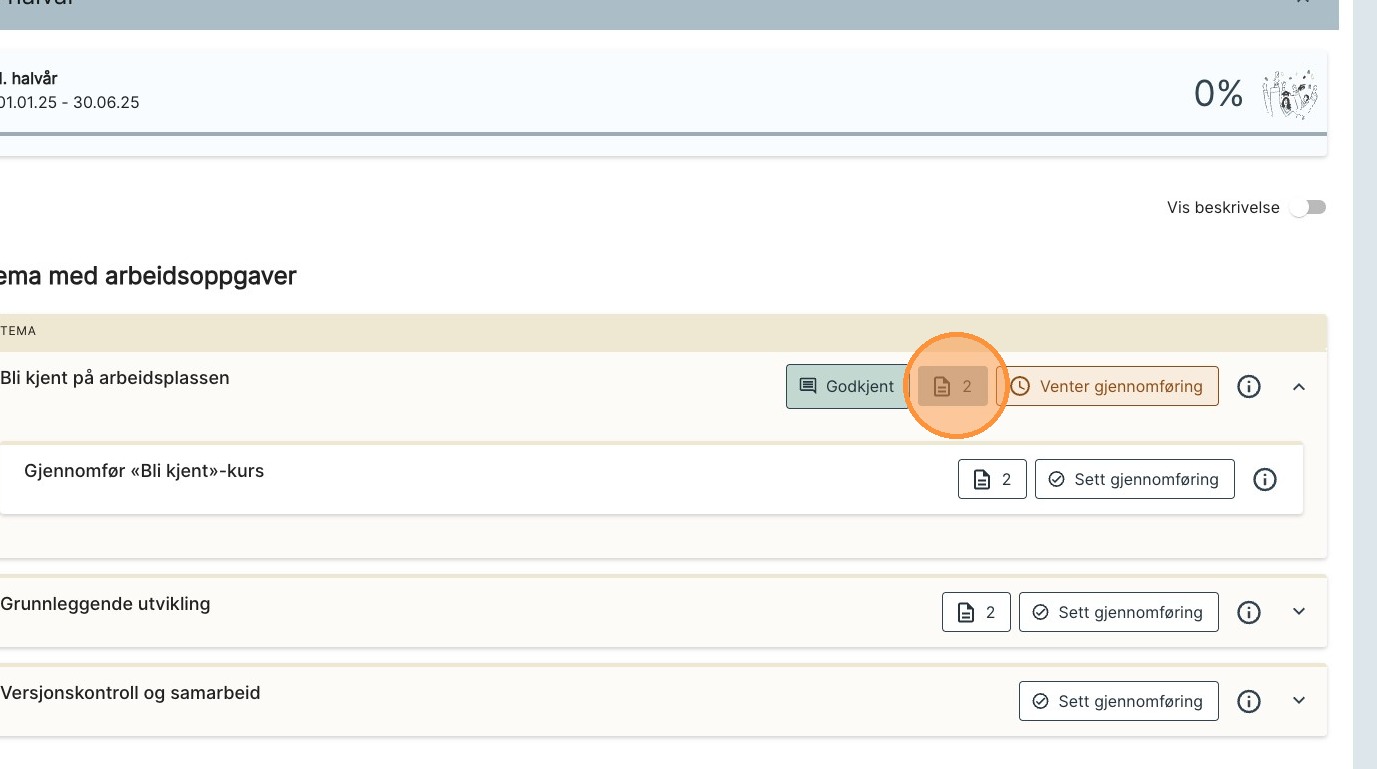 4. For å lese dokumentasjoner som er knyttet til elementer i opplæringsboka, trykk på knappen med et dokument og et tall (antall dokumentasjoner).