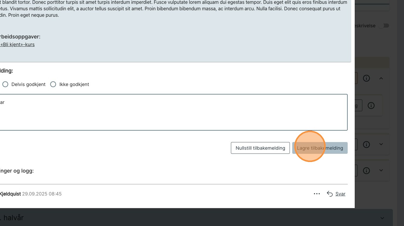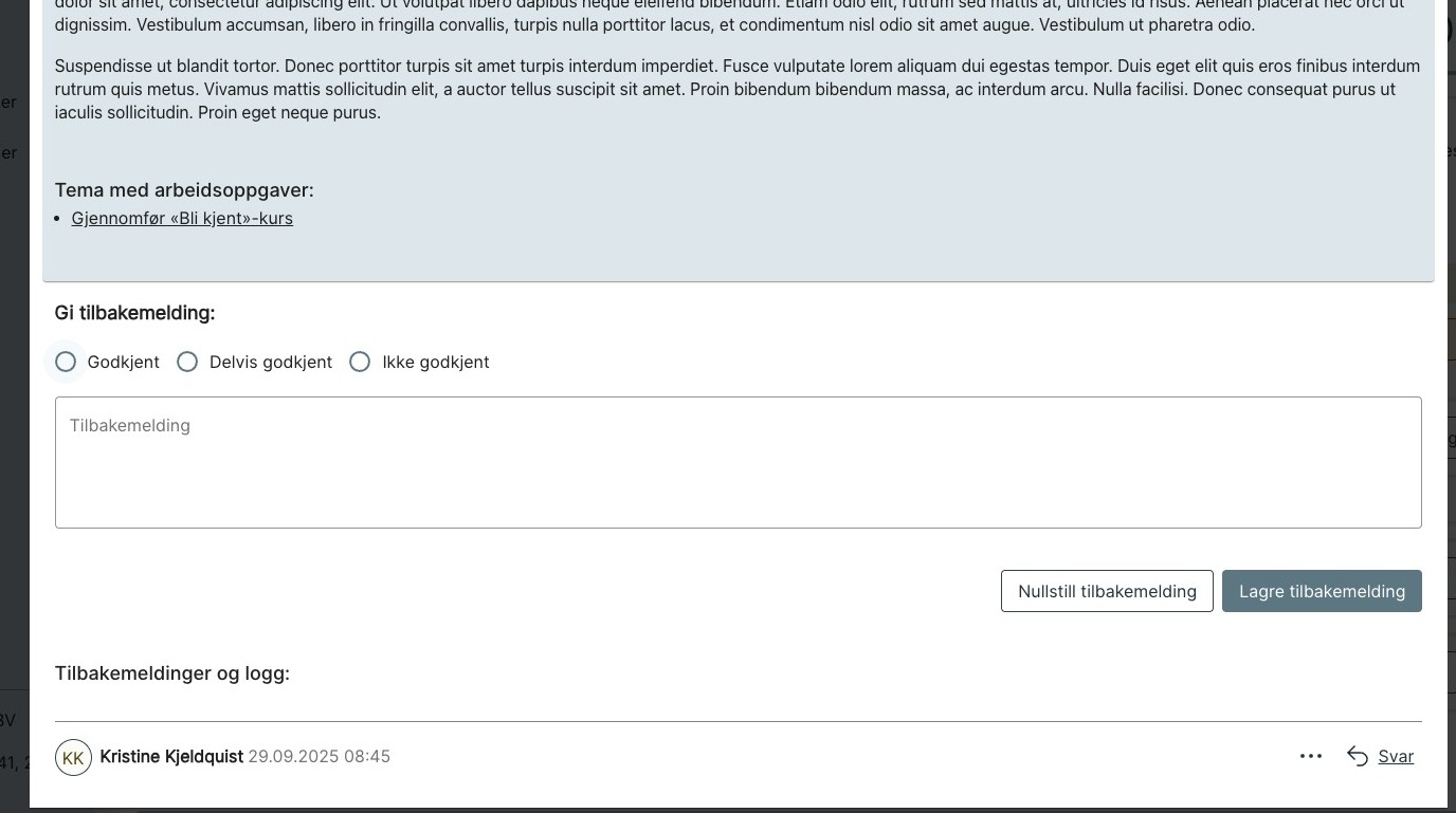 Obs: Velger du «Delvis godkjent» eller «Ikke godkjent» må du skrive en kommentar for å kunne lagre tilbakemeldingen.