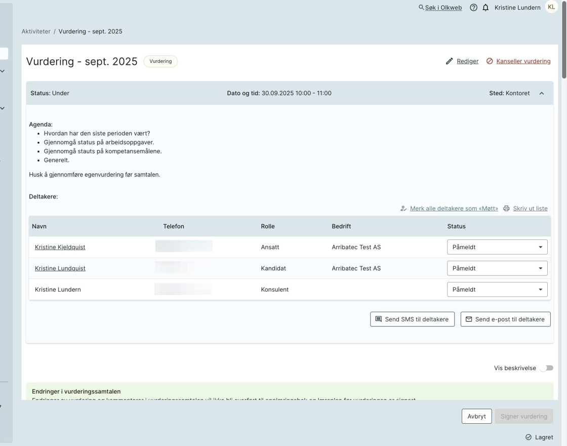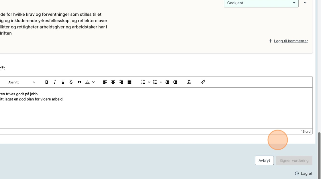 Obs: Per dags dato kan vurderingssamtaler ikke redigeres etter de har blitt «Signert». Trykk derfor ikke på denne knappen før du er klar for signering.