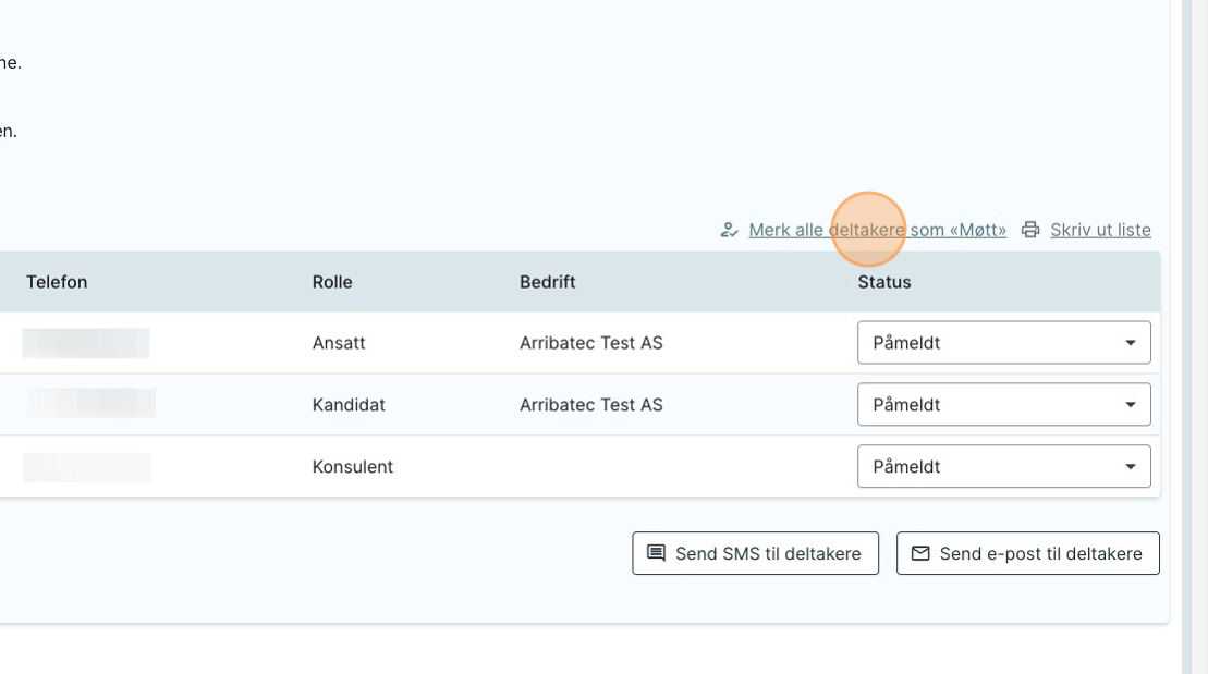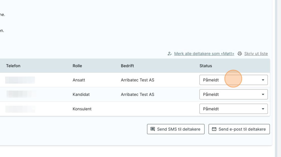 3. Ønskes det å endre statusen på kun en deltaker, gjøres dette ved å trykke på status-feltet til deltakeren.