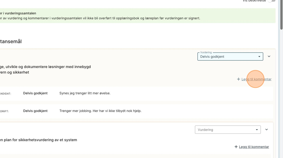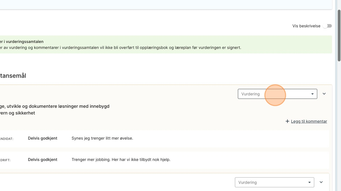 Tips: Velger man å ikke vurdere et element vil dette stå som uvurdert både i referatet etter samtalen og i opplæringsboken til kandidaten.