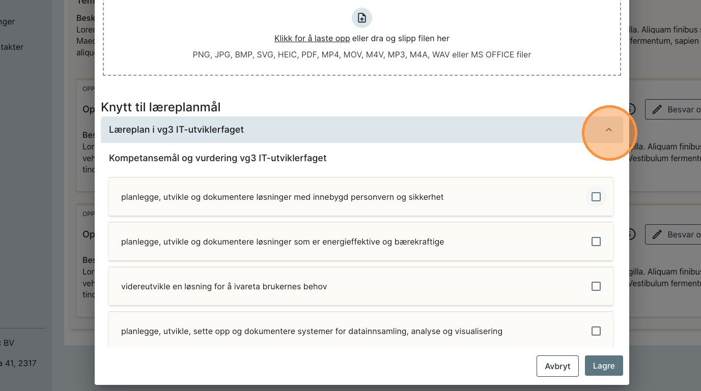Dette gjøres ved å trykke på pilen på læreplanen du vil knytte innleveringen til.