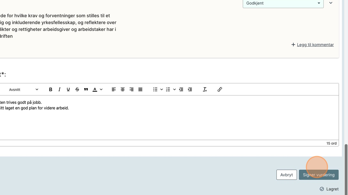 Obs: Per dags dato kan vurderingssamtaler ikke redigeres etter de har blitt «Signert». Trykk derfor ikke på denne knappen før du er klar for signering.
