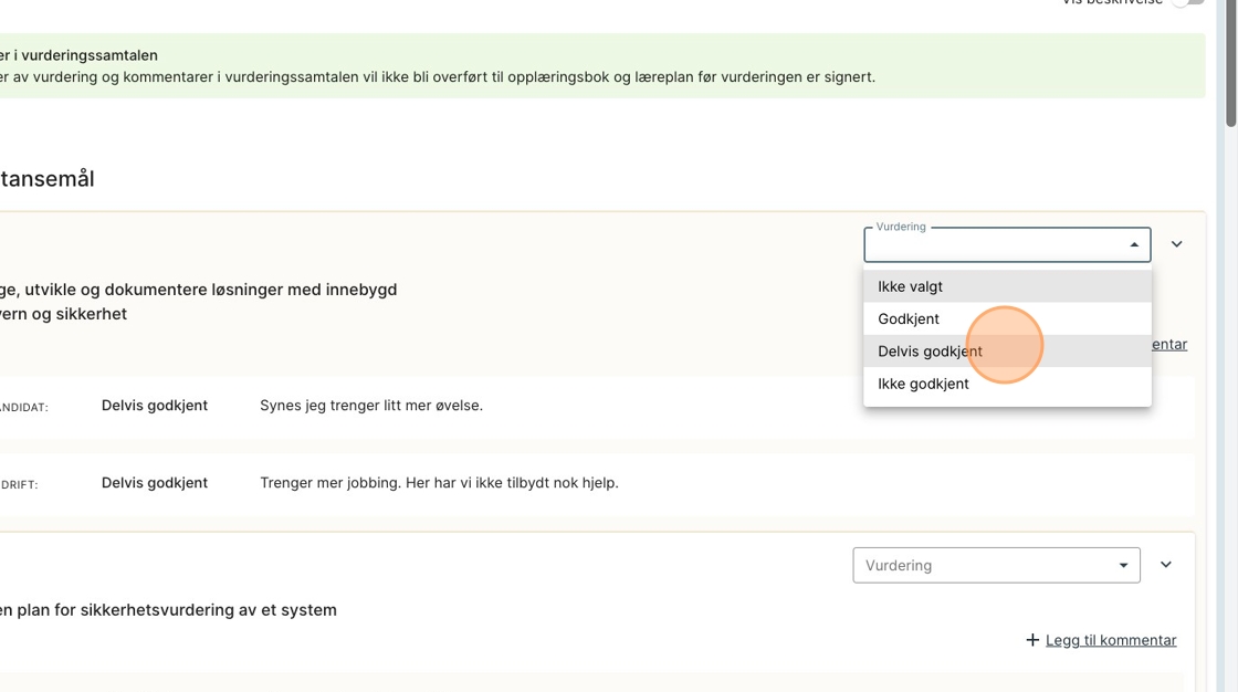 Tips: Velger man å ikke vurdere et element vil dette så uten vurderings-status i etter samtalen. Og den vil stå som uvurdert i opplæringsboka til kandidaten.