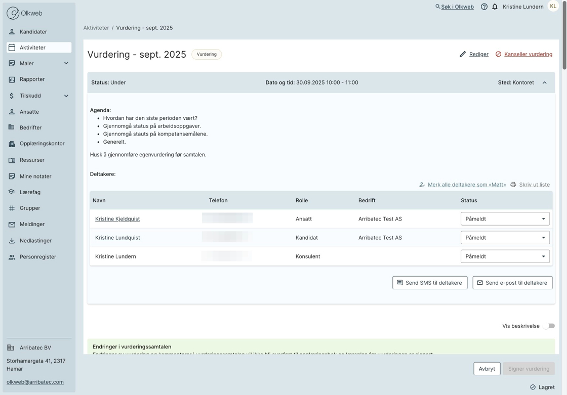 • Sette oppmøte status på deltageren